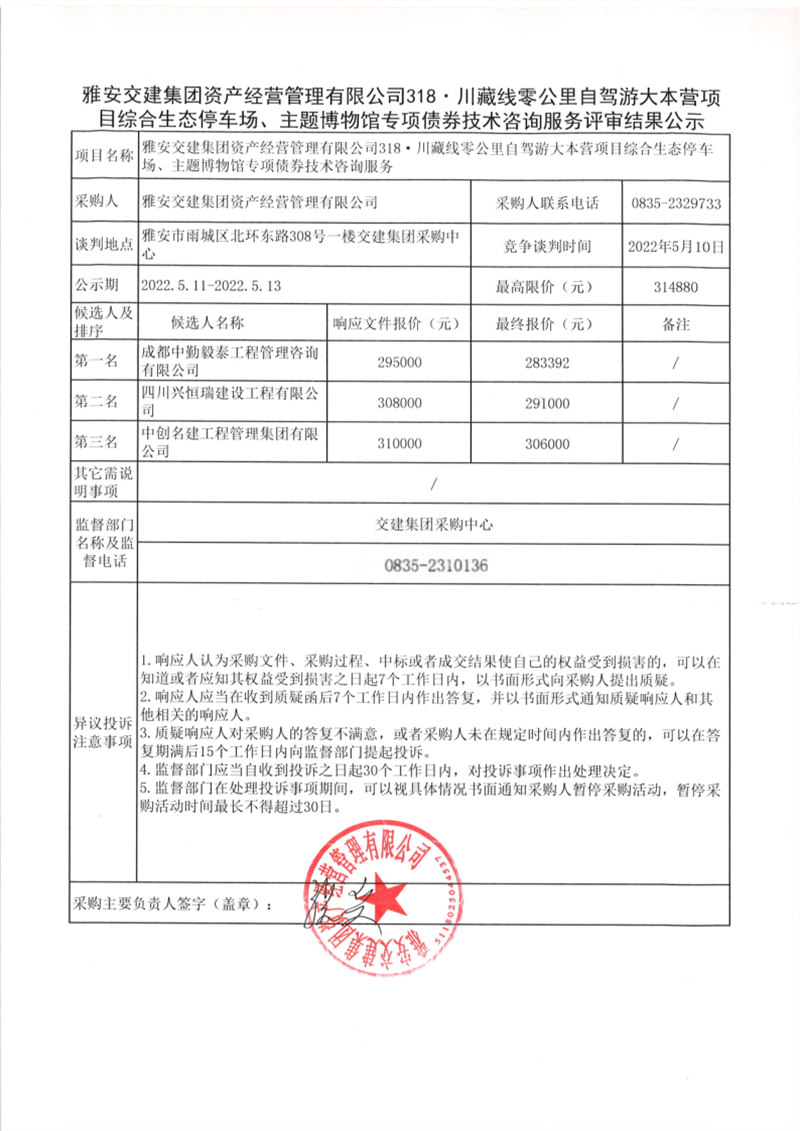 雅安交建集團(tuán)資產(chǎn)經(jīng)營(yíng)管理有限公司318·川藏線(xiàn)零公里自駕游大本營(yíng)項(xiàng)目綜合生態(tài)停車(chē)場(chǎng)、主題博物館專(zhuān)項(xiàng)債券技術(shù)咨詢(xún)服務(wù)評(píng)審結(jié)果公示