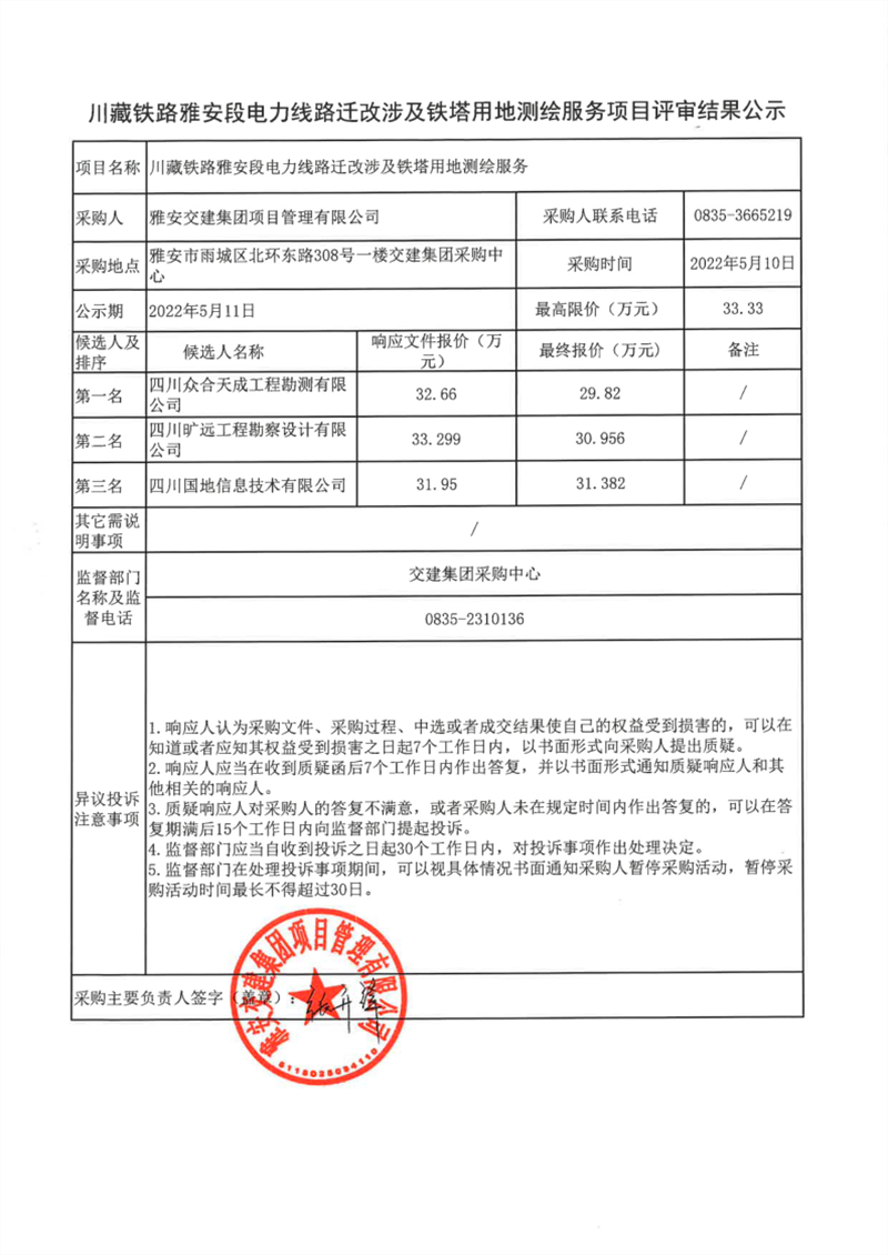 雅安交建集團項目管理有限公司川藏鐵路雅安段電力線路遷改涉及鐵塔用地測繪服務(wù)項目評審結(jié)果公示