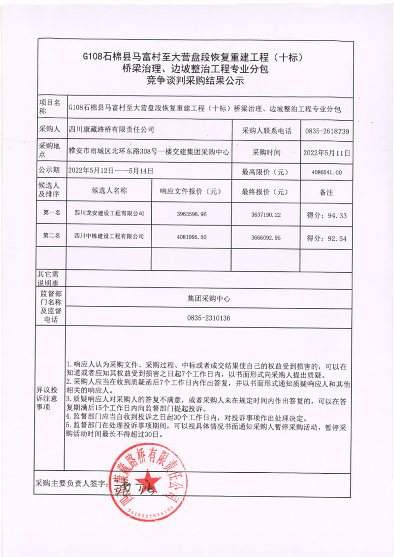 四川康藏路橋有限責(zé)任公司G108線石棉縣馬富村至大營(yíng)盤(pán)段恢復(fù)重建工程(十標(biāo))橋梁治理、邊坡整治工程專(zhuān)業(yè)分包競(jìng)爭(zhēng)談判采購(gòu)結(jié)果公示