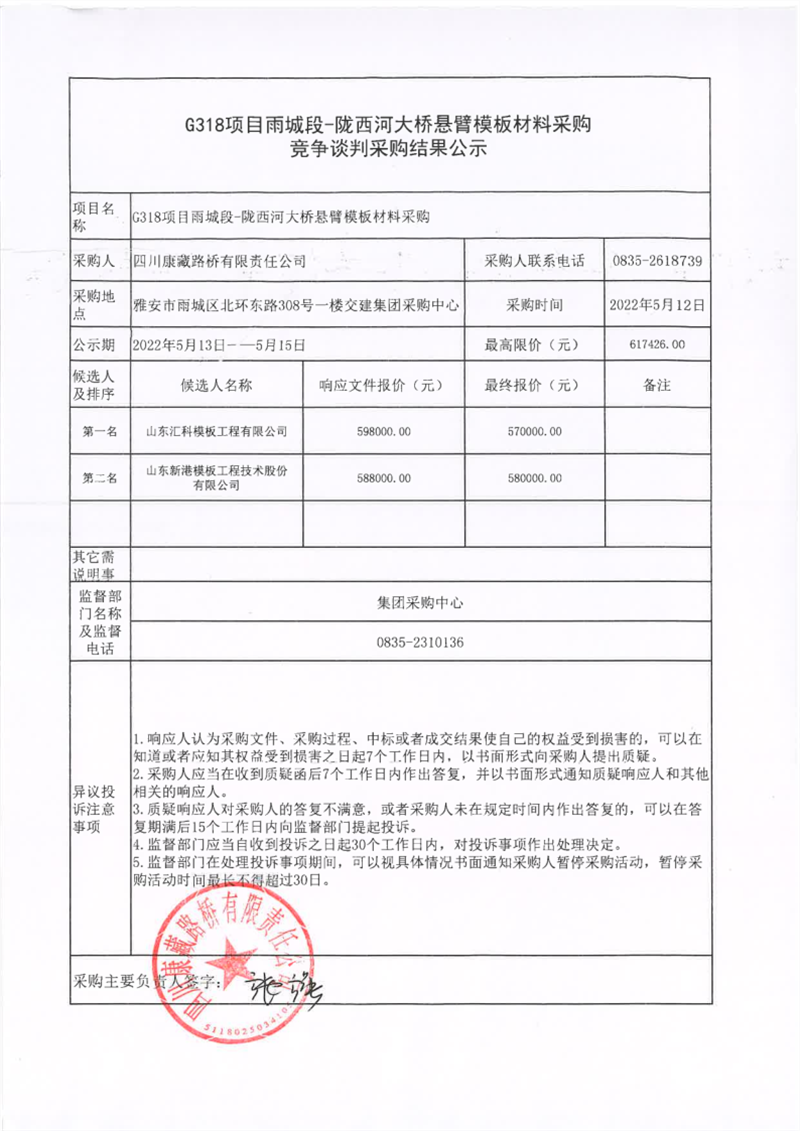 四川康藏路橋有限責任公司G318項目雨城段-隴西河大橋懸臂模板材料采購競爭談判采購結果公示