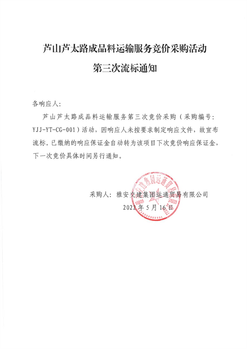 雅安交建集團(tuán)運(yùn)通貿(mào)易有限公司蘆山蘆太路成品料運(yùn)輸服務(wù)競價(jià)采購活動第三次流標(biāo)通知