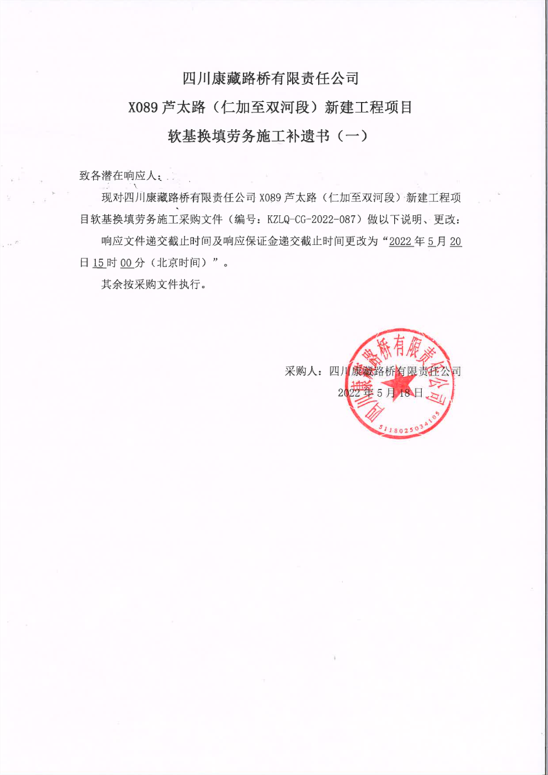 四川康藏路橋有限責(zé)任公司X089蘆太路(仁加至雙河段)新建工程項目軟基換填勞務(wù)施工補(bǔ)遺書(一)