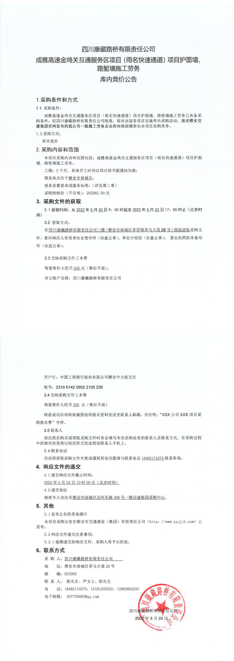 四川康藏路橋有限責(zé)任公司成雅高速金雞關(guān)互通服務(wù)區(qū)項(xiàng)目(雨名快速通道)項(xiàng)目護(hù)面墻、路塹墻施工勞務(wù)庫內(nèi)競價(jià)公告