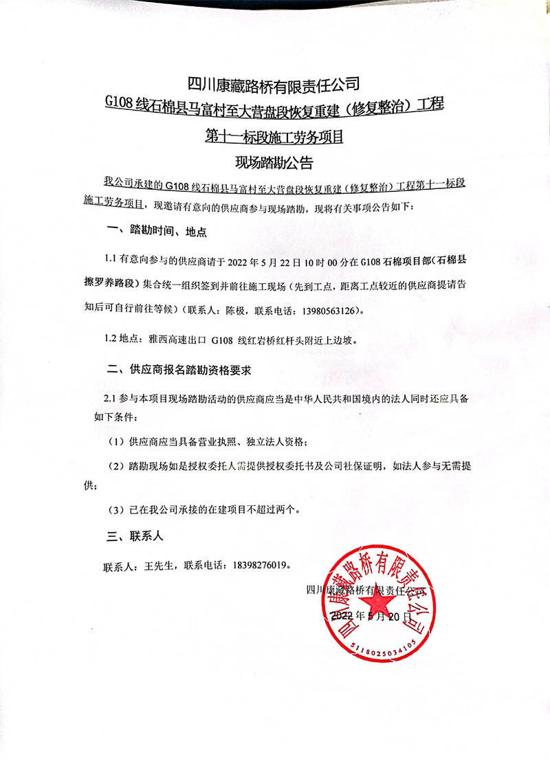 四川康藏路橋有限責(zé)任公司G108線石棉縣馬福村至大營盤段恢復(fù)重建(修復(fù)整治)工程第十一標(biāo)段施工勞務(wù)項(xiàng)目現(xiàn)場(chǎng)踏勘公告