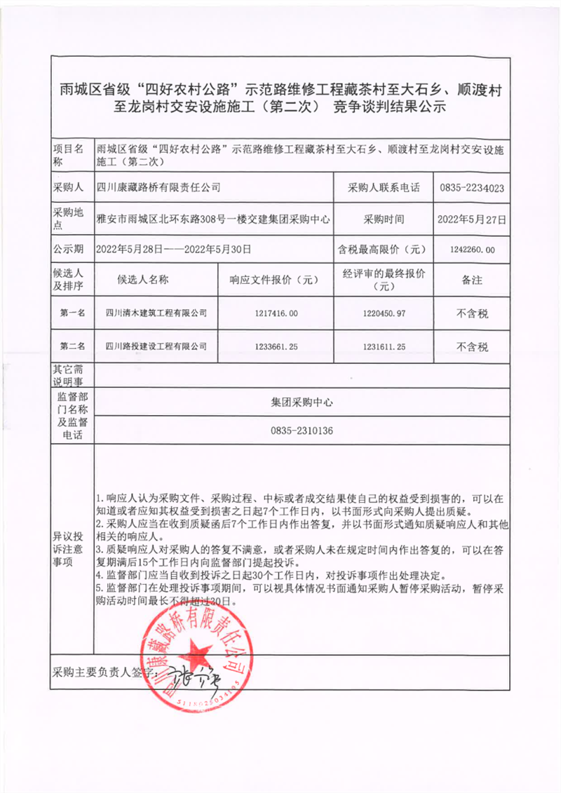 四川康藏路橋有限責任公司雨城區(qū)省級“四好農村公路”示范路維修工程藏茶村至大石鄉(xiāng)、順渡村至龍崗村交安設施施工(第二次)競爭談判結果公示