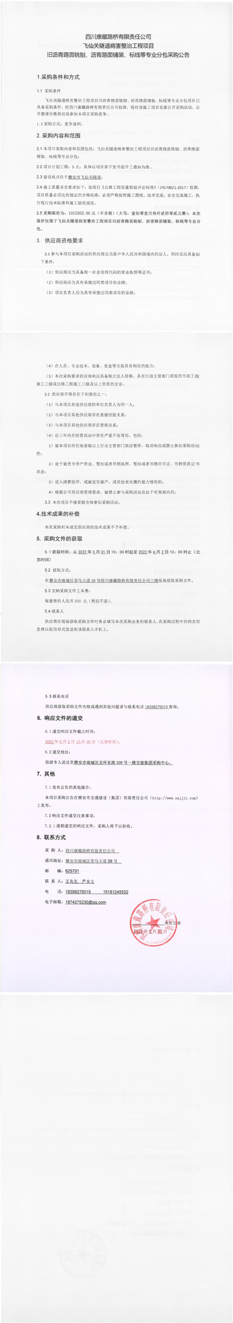 四川康藏路橋有限責任公司飛仙關(guān)隧道病害整治工程項目舊瀝青路面銑刨、瀝青路面鋪裝、標線等專業(yè)分包采購公告