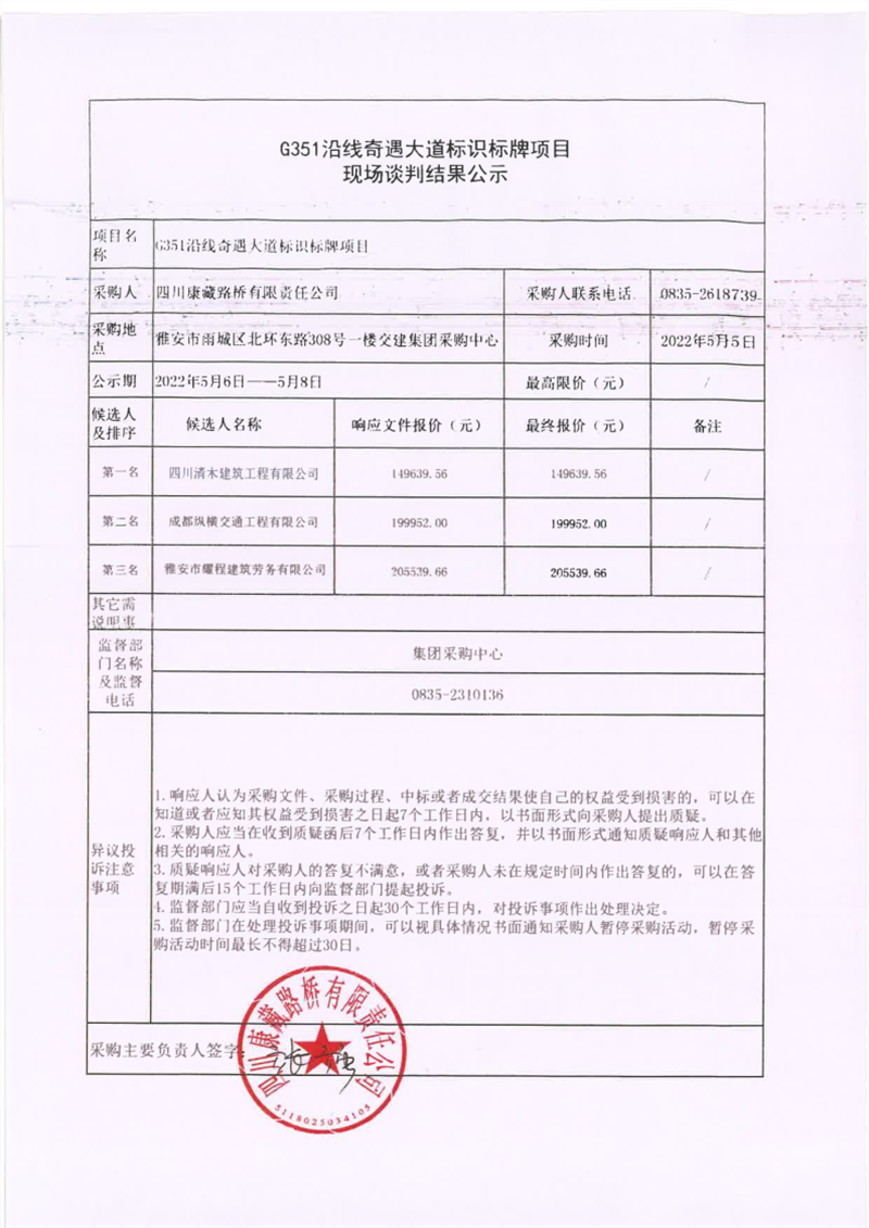四川康藏路橋有限責(zé)任公司G351沿線奇遇大道標(biāo)識(shí)標(biāo)牌項(xiàng)目現(xiàn)場(chǎng)談判結(jié)果公示