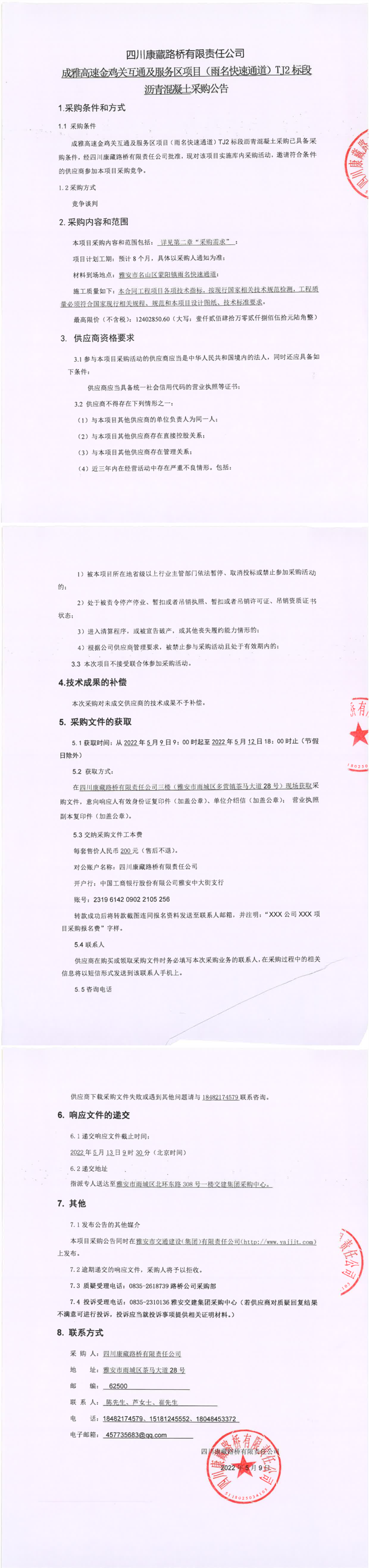四川康藏路橋有限責(zé)任公司成雅高速金雞關(guān)互通及服務(wù)區(qū)項(xiàng)目(雨名快速通道)TJ2標(biāo)段瀝青混凝土采購(gòu)公告