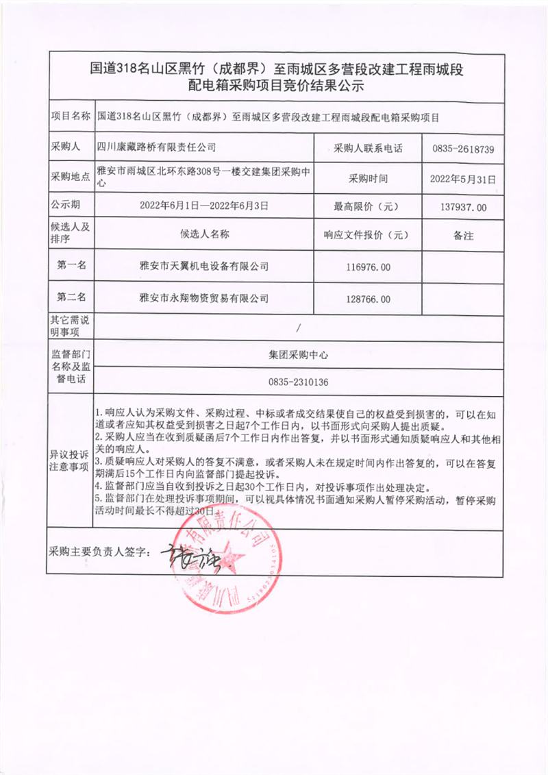 四川康藏路橋有限責(zé)任公司國道318名山區(qū)黑竹(成都界)至雨城區(qū)多營段改建工程雨城段配電箱采購項(xiàng)目競價結(jié)果公示