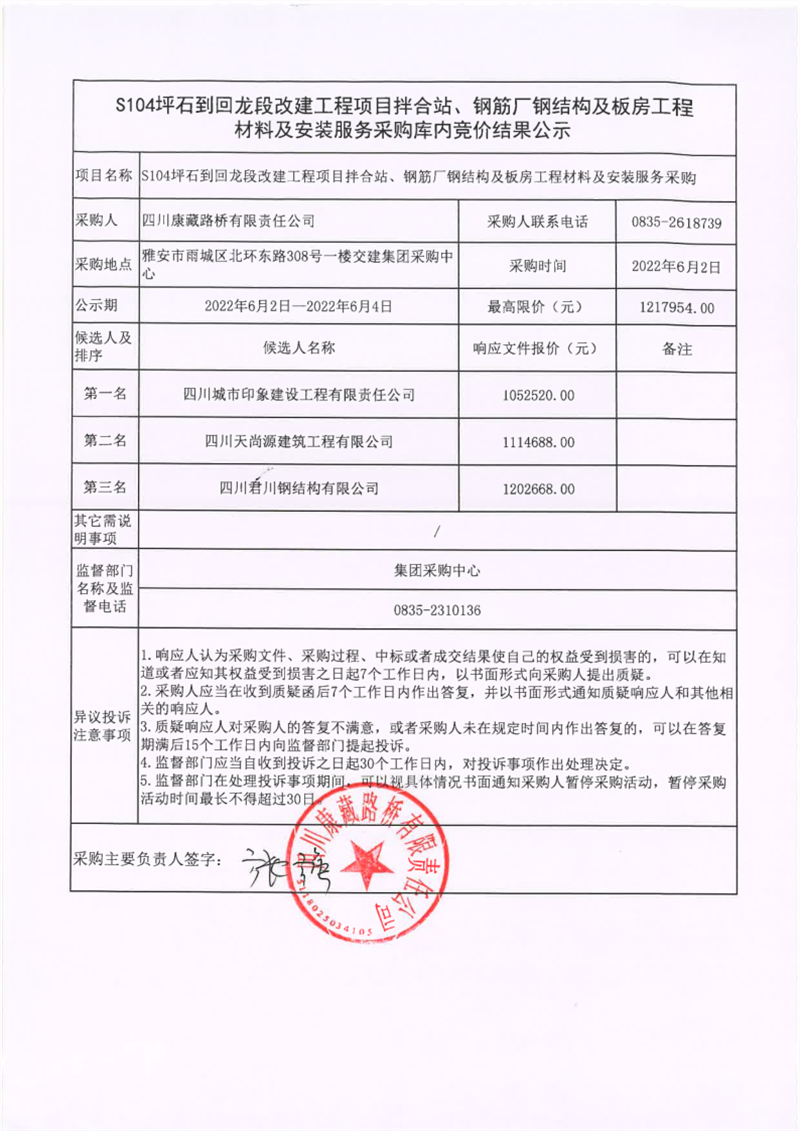 四川康藏路橋有限責任公司S104坪石到回龍段改建工程項目拌合站、鋼筋廠鋼結(jié)構(gòu)及板房工程材料及安裝服務庫內(nèi)競價結(jié)果公示