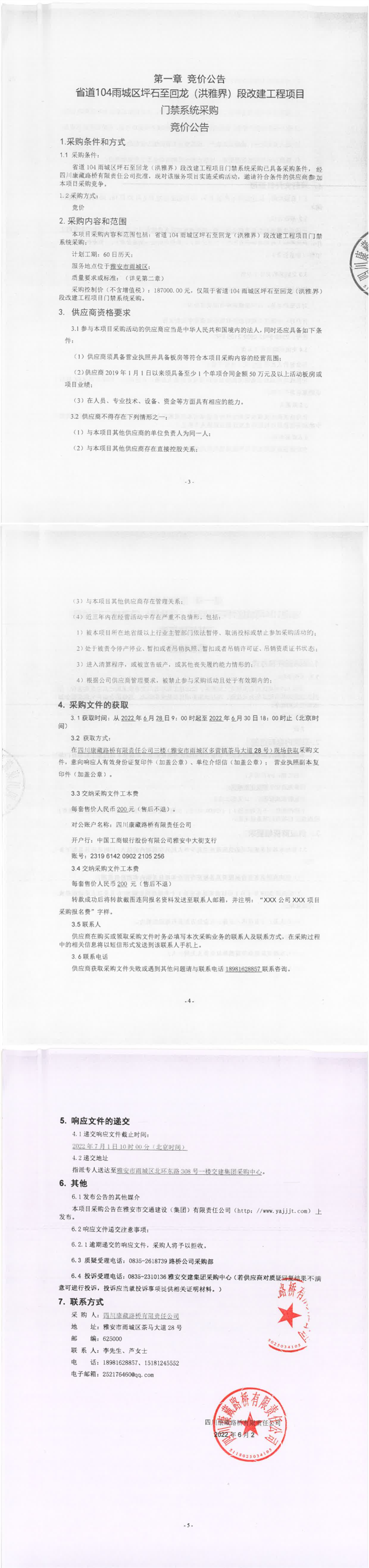 四川康藏路橋有限責(zé)任公司省道104雨城區(qū)坪石至回龍(洪雅界)段改建工程項(xiàng)目門(mén)禁系統(tǒng)采購(gòu)