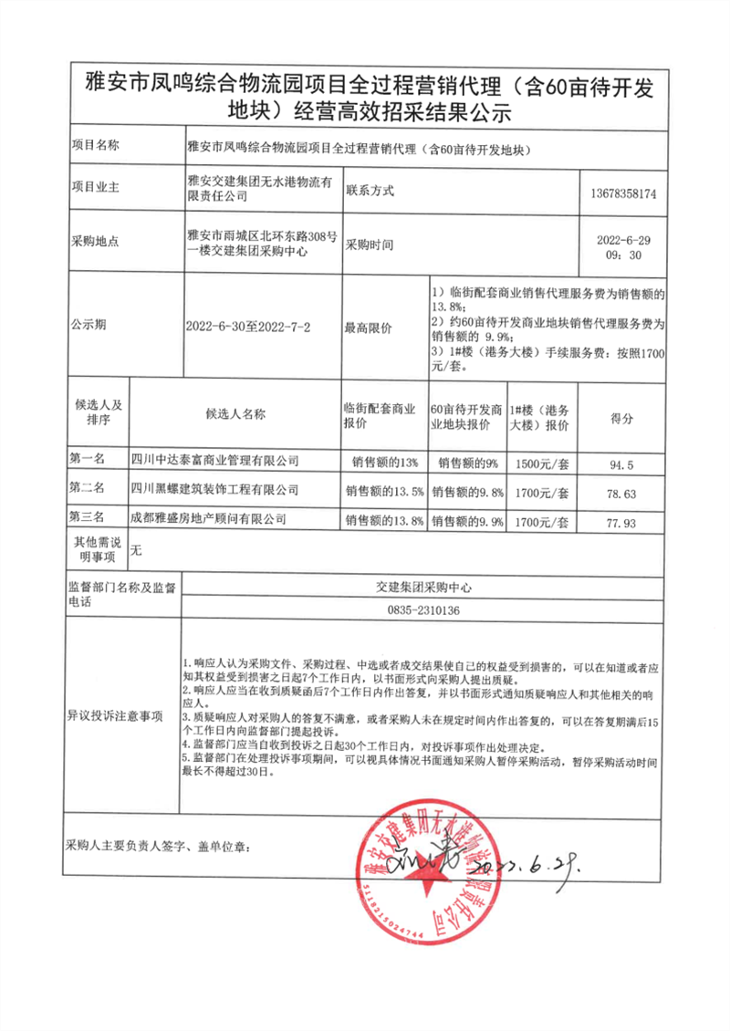 雅安交建集團(tuán)無(wú)水港物流有限責(zé)任公司雅安市鳳鳴綜合物流園項(xiàng)目全過(guò)程營(yíng)銷(xiāo)代理(含60畝待開(kāi)發(fā)地塊)經(jīng)營(yíng)高效招采結(jié)果公示