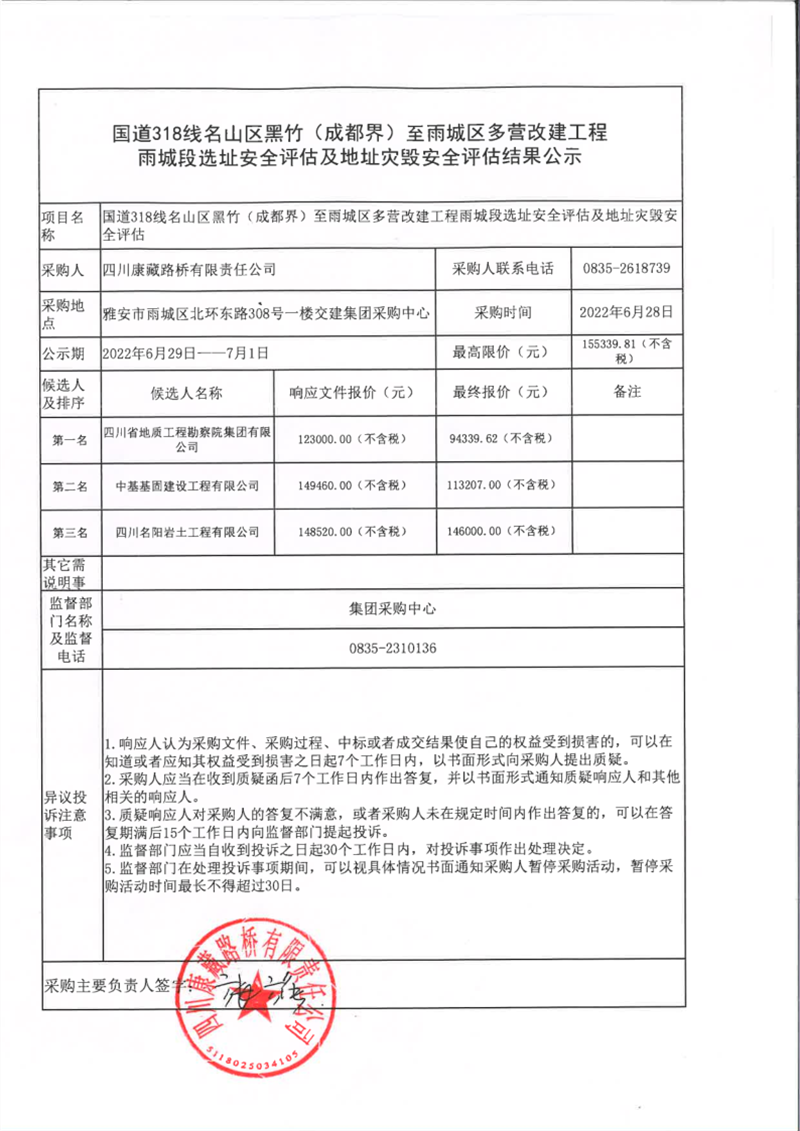 四川康藏路橋有限責任公司國道318名山區(qū)黑竹(成都界)至雨城區(qū)多營段改建工程雨城段選址安全評估及地址災毀安全評估結(jié)果公示