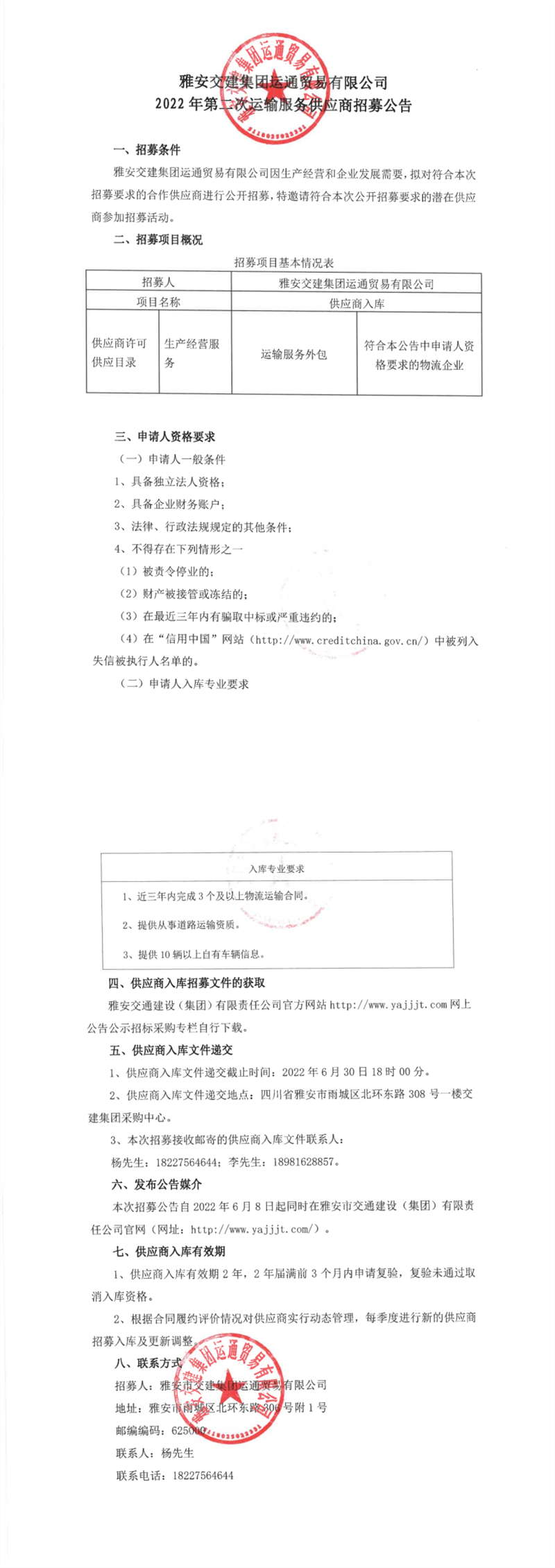 雅安交建集團運通貿易有限公司2022年第二次運輸服務供應商招募公告