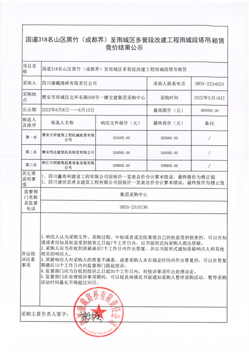 四川康藏路橋有限責任公司國道318名山區(qū)黑竹(成都界)至雨城區(qū)多營段改建工程雨城段塔吊租賃競價結(jié)果公示