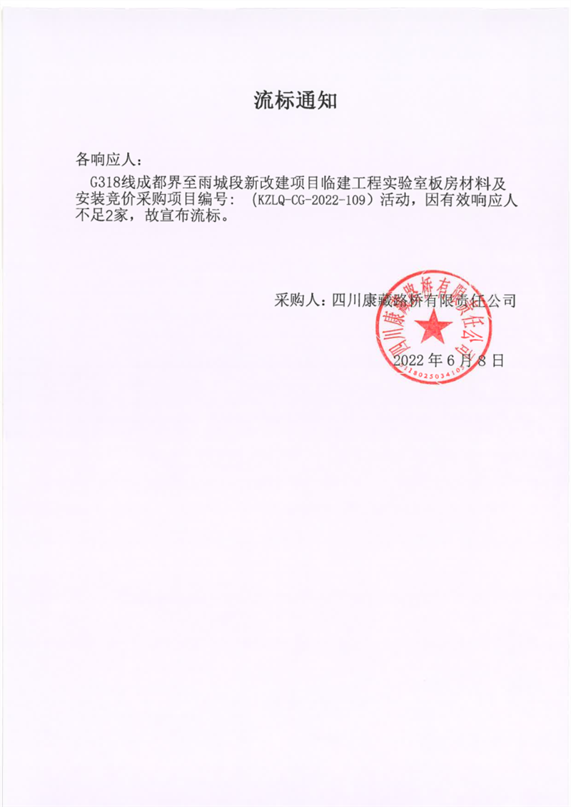 四川康藏路橋有限責(zé)任公司G318線成都界至雨城段新改建項目臨建工程實驗室板房材料及安裝采購流標(biāo)通知