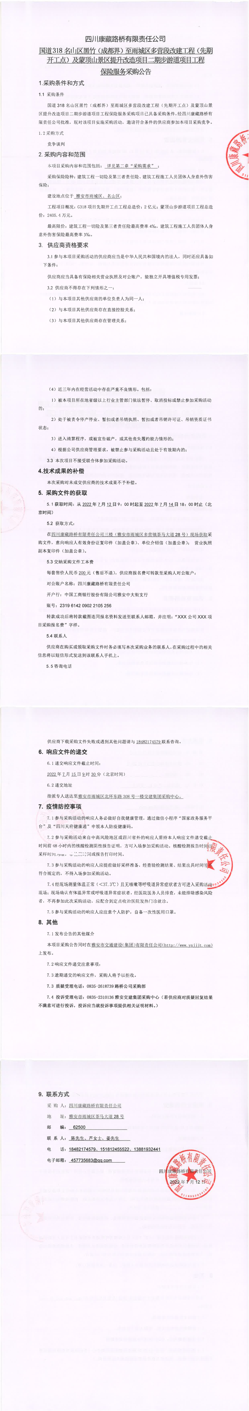 四川康藏路橋有限責(zé)任公司國道318名山區(qū)黑竹(成都界)至雨城區(qū)多營段改建工程(先期開工點)及蒙頂山景區(qū)提升改造項目二期步游道項目工程保險服務(wù)采購公告
