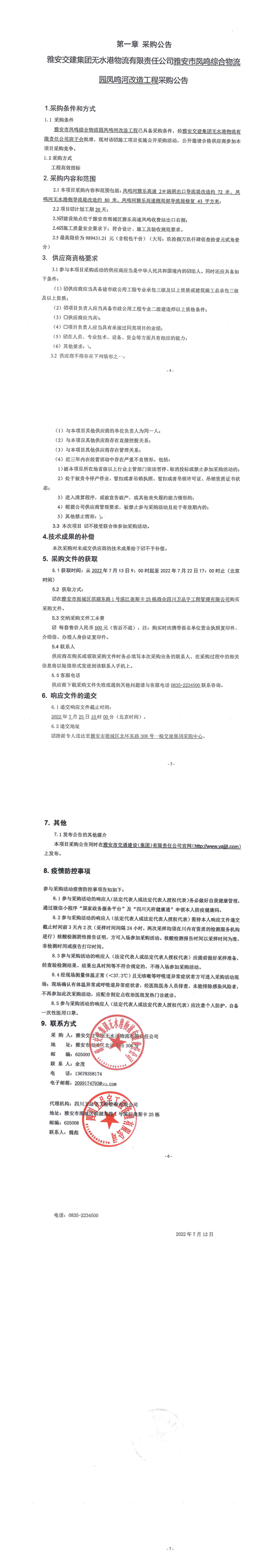 雅安交建集團無水港物流有限責任公司雅安市鳳鳴綜合物流園鳳鳴河改造工程采購公告