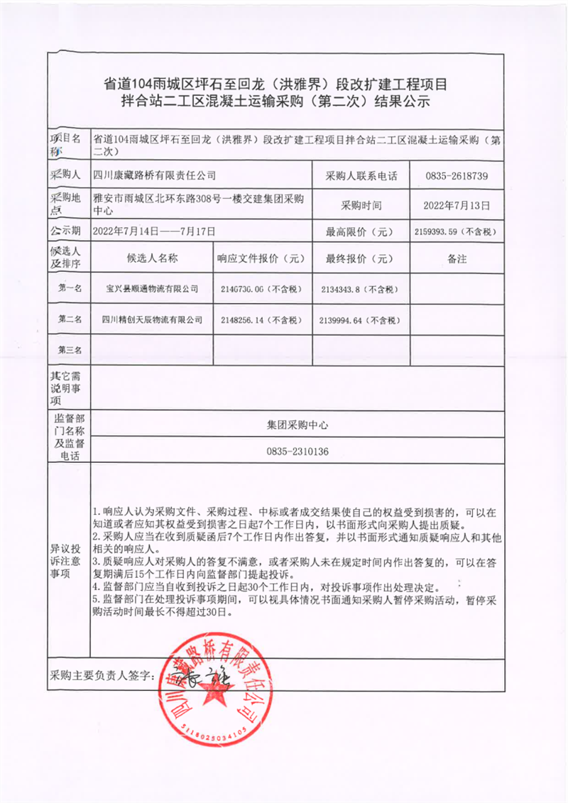 四川康藏路橋有限責任公司省道104線雨城區(qū)坪石至回龍(洪雅界)段改擴建工程項目拌合站二工區(qū)混凝土運輸采購(第二次)結(jié)果公示