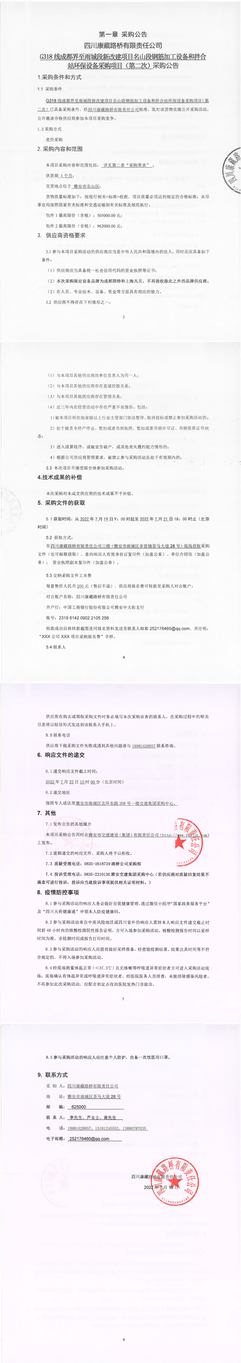 四川康藏路橋有限責任公司G318線成都界至雨城段新改建項目名山段鋼筋加工設備和拌合站環(huán)保設備采購項目(第二次)采購公告