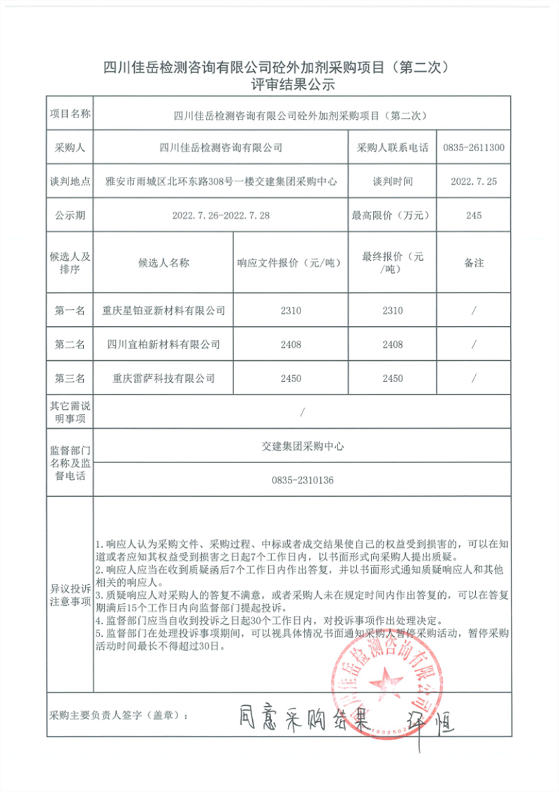 四川佳岳檢測咨詢有限公司砼外加劑采購項目(第二次)評審結(jié)果公示