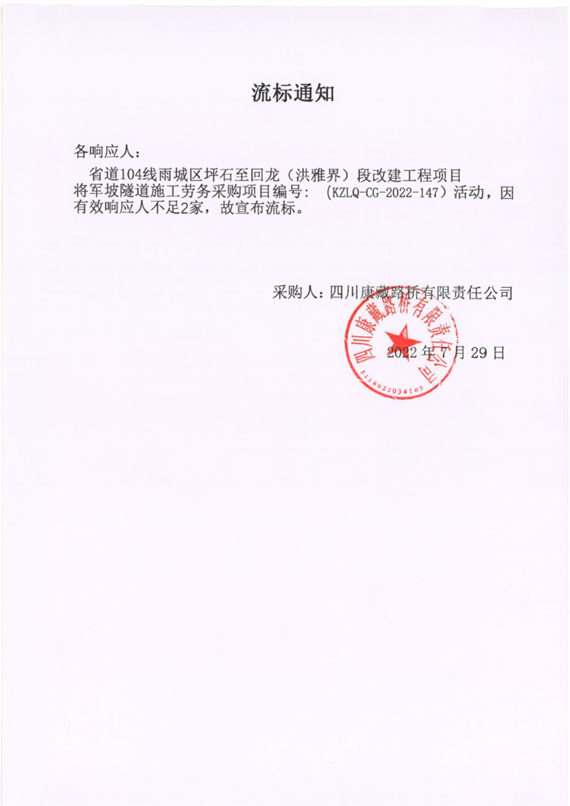 四川康藏路橋有限責(zé)任公司省道104線雨城區(qū)坪石至回龍(洪雅界)段改建工程項(xiàng)目將軍坡隧道施工勞采購流標(biāo)通知