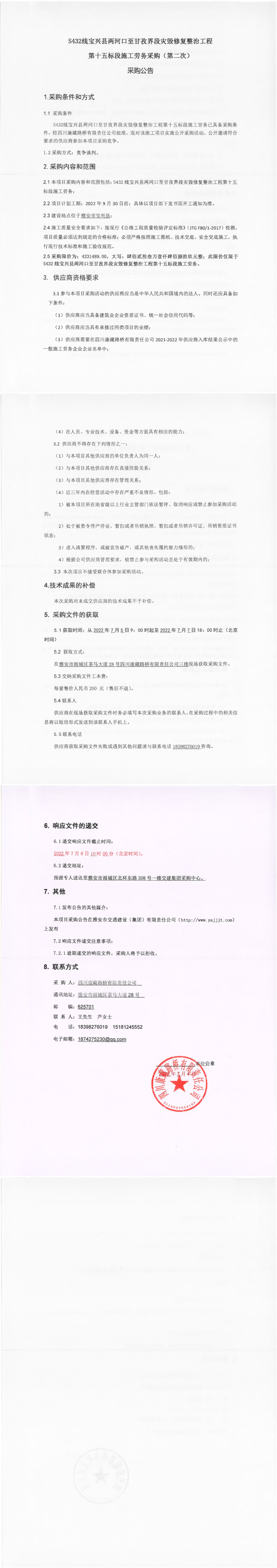 四川康藏路橋有限責任公司S432線寶興縣兩河口至甘孜界段災(zāi)毀修復(fù)整治工程第十五標段施工勞務(wù)采購(第二次)采購公告