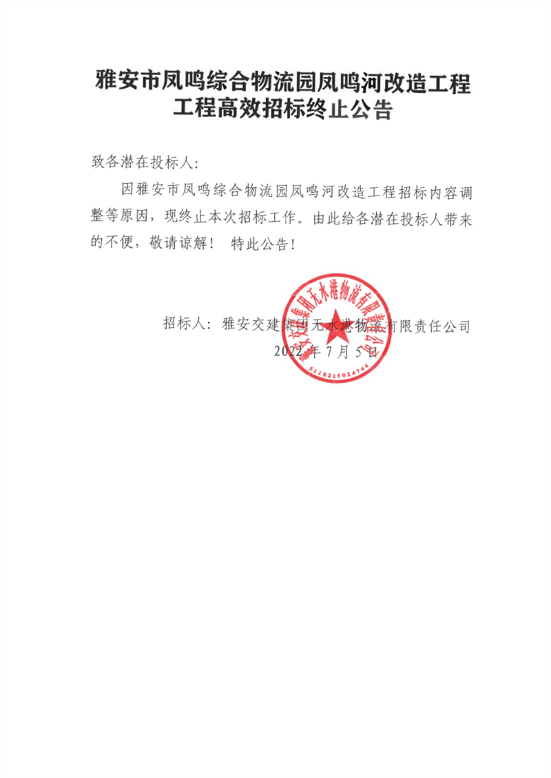 雅安交建集團無水港物流有限責(zé)任公司雅安市鳳鳴綜合物流園鳳鳴河改造工程高效招標(biāo)終止公告
