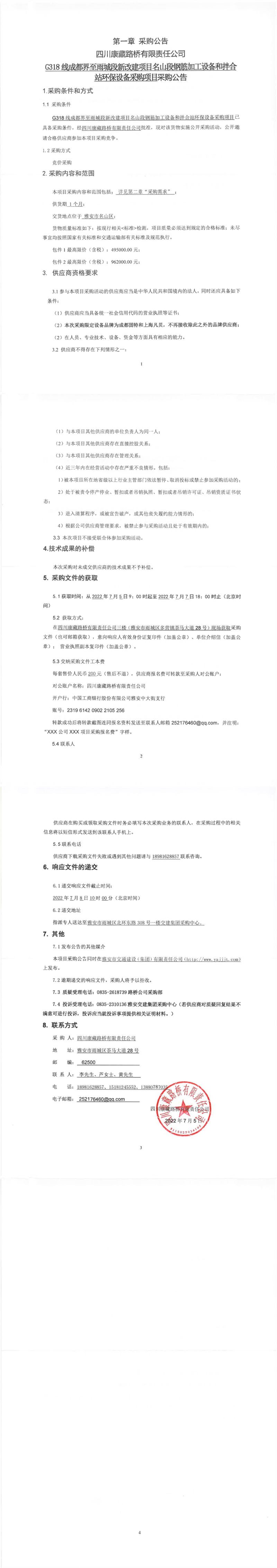 四川康藏路橋有限責(zé)任公司G318線成都界至雨城段新改建項目名山段鋼筋加工設(shè)備和拌合站環(huán)保設(shè)備采購項目采購公告