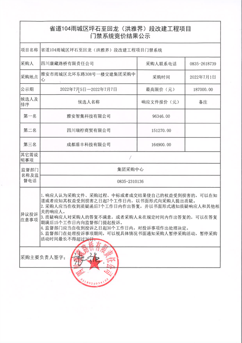 四川康藏路橋有限責(zé)任公司省道104雨城區(qū)坪石至回龍(洪雅界)段改建工程門禁系統(tǒng)競價結(jié)果公示