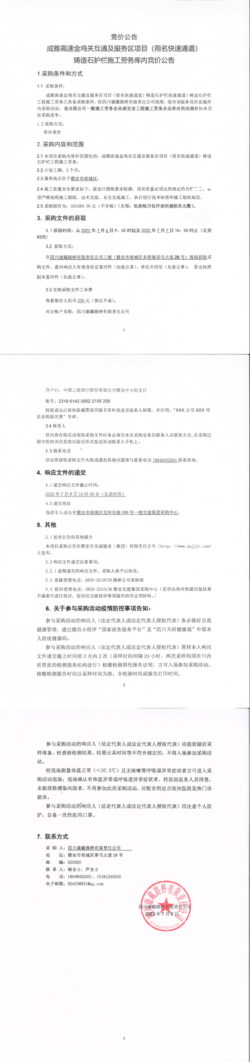四川康藏路橋有限責任公司成雅高速金雞關互通及服務區(qū)項目(雨名快速通道)鑄造石護欄施工勞務庫內(nèi)競價公告