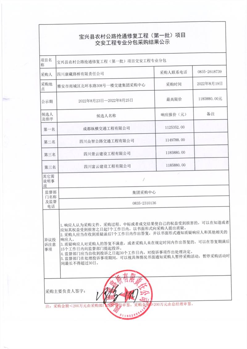 四川康藏路橋有限責任公司寶興縣農村公路搶通修復工程(第一批)交安工程專業(yè)分包采購結果公示