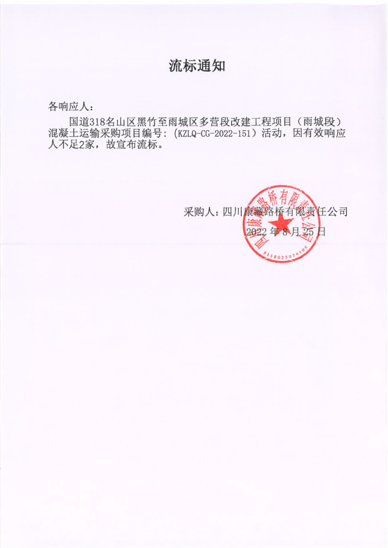 四川康藏路橋有限責(zé)任公司國道318名山區(qū)黑竹至雨城區(qū)多營段改建工程項目(雨城段)混凝土運輸采購項目流標(biāo)通知