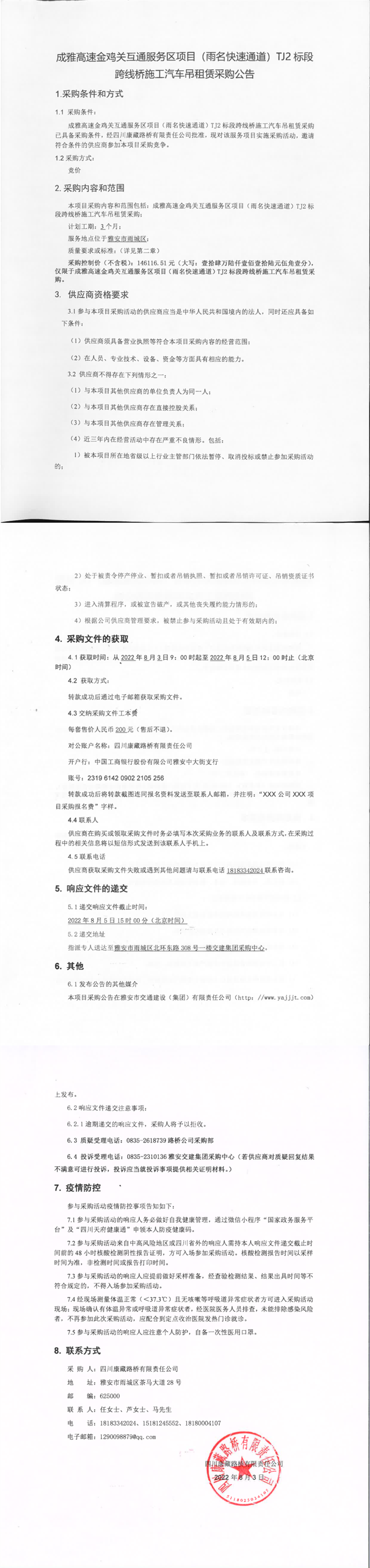 四川康藏路橋有限責(zé)任公司成雅高速金雞關(guān)互通服務(wù)區(qū)項(xiàng)目(雨名快速通道)TJ2標(biāo)段跨線橋施工汽車吊租賃采購公告