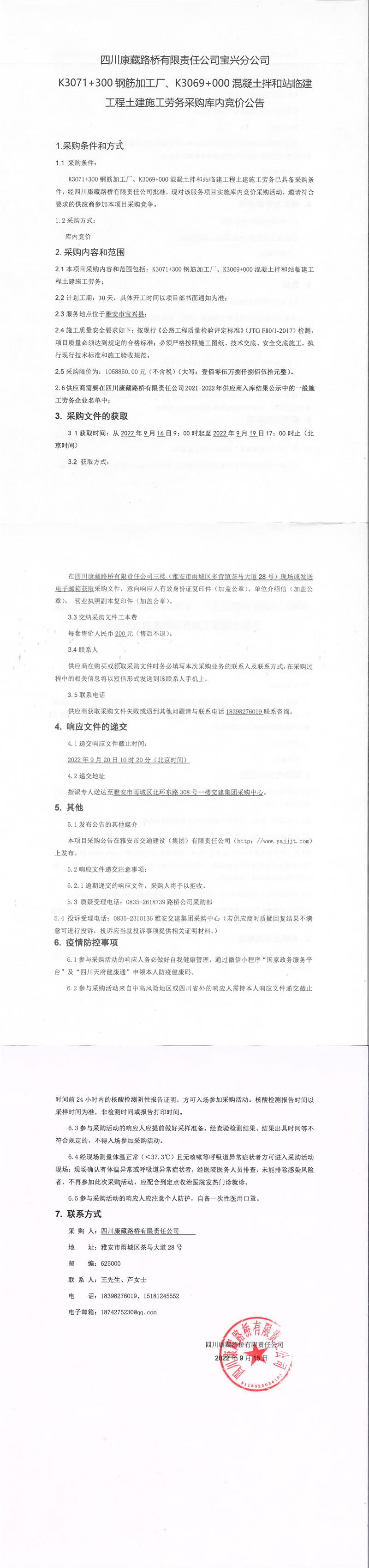 四川康藏路橋有限責(zé)任公司寶興分公司K3071+300鋼筋加工廠、K3069+000混凝土拌和站臨建工程土建施工勞務(wù)采購庫內(nèi)競(jìng)價(jià)公告