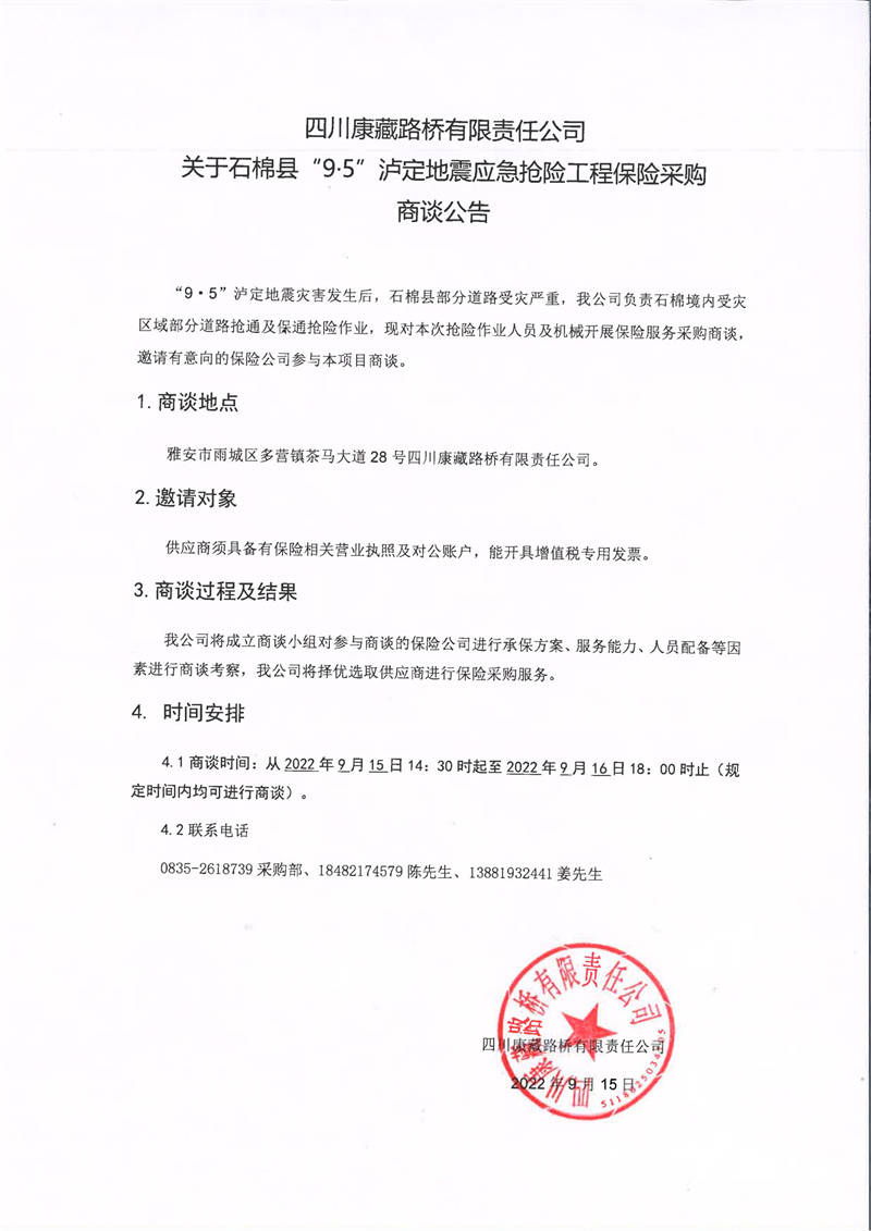 四川康藏路橋有限責任公司關(guān)于石棉縣“9·5”瀘定地震應急搶險工程保險采購商談公告