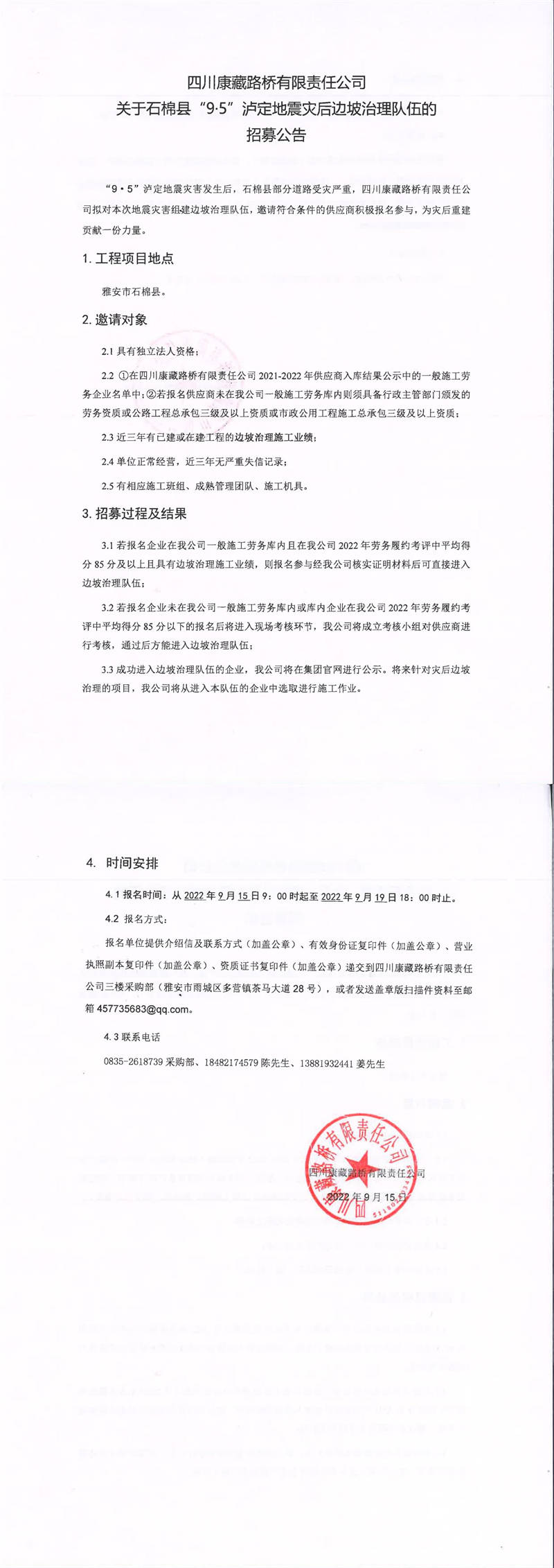 四川康藏路橋有限責(zé)任公司關(guān)于石棉縣“9·5”瀘定地震災(zāi)后邊坡治理隊伍的招募公告