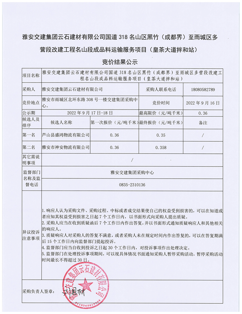 雅安交建集團(tuán)云石建材有限公司國道318名山區(qū)黑竹(成都界)至雨城區(qū)多營段改建工程雨城段成品料運(yùn)輸服務(wù)項(xiàng)目(皇茶大道拌和站)競價(jià)結(jié)果公示