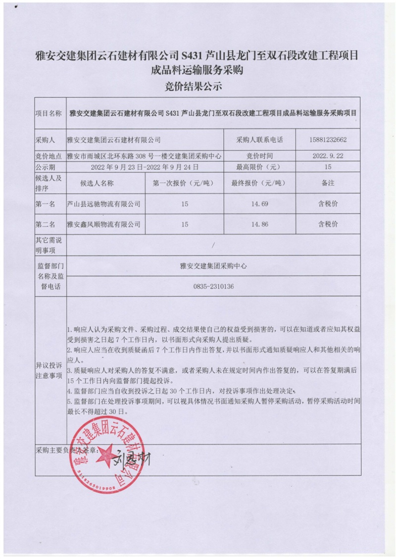 雅安交建集團(tuán)云石建材有限公司S431蘆山縣龍門至雙石段改建工程項目成品料運(yùn)輸服務(wù)采購競價結(jié)果公示