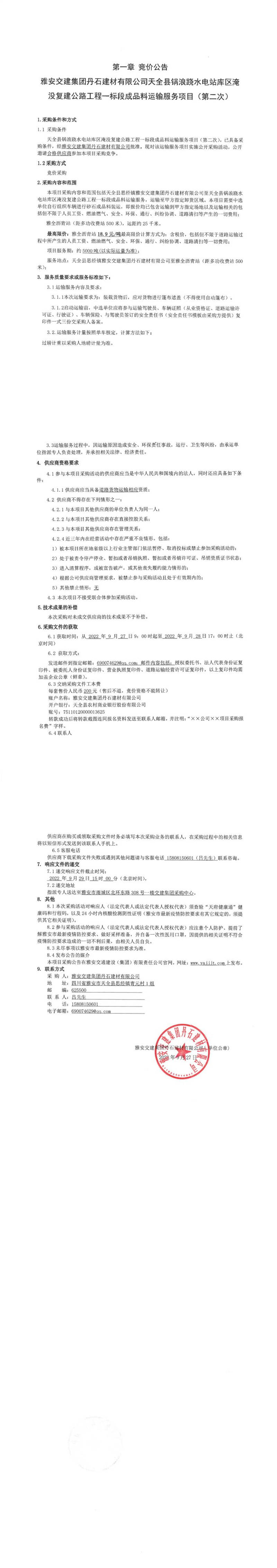 雅安交建集團(tuán)丹石建材有限公司天全縣鍋浪蹺水電站庫區(qū)淹沒復(fù)建公路工程一標(biāo)段成品料運(yùn)輸服務(wù)項(xiàng)目(第二次)競價公告