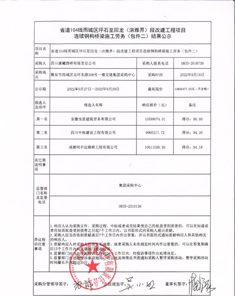 四川康藏路橋有限責(zé)任公司省道104線(xiàn)雨城區(qū)坪石至回龍(洪雅界)段改建工程項(xiàng)目連續(xù)鋼構(gòu)橋梁施工勞務(wù)(包件二)結(jié)果公示