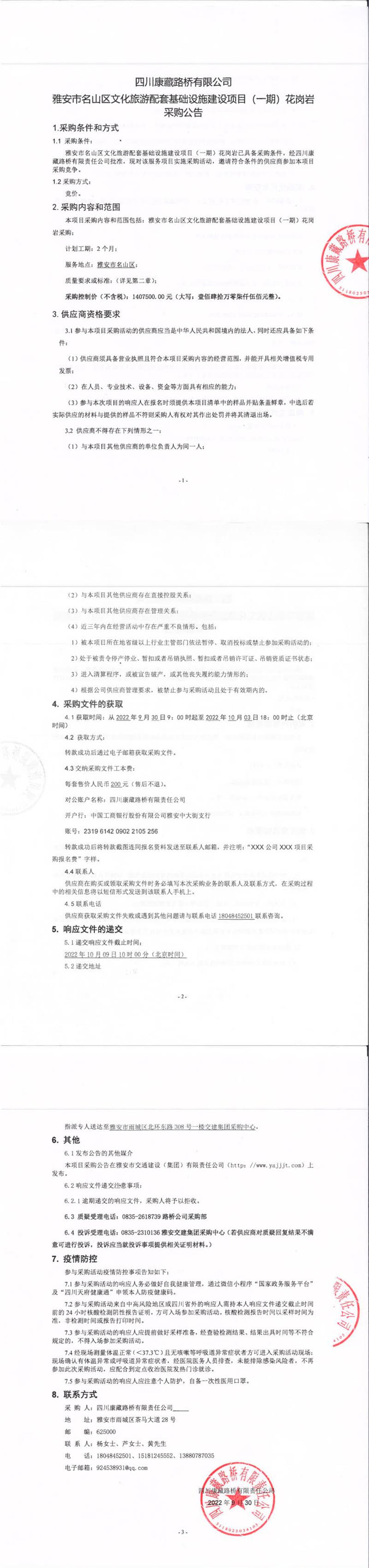 四川康藏路橋有限公司雅安市名山區(qū)文化旅游配套基礎(chǔ)設(shè)施建設(shè)項(xiàng)目(一期)花崗巖采購公告