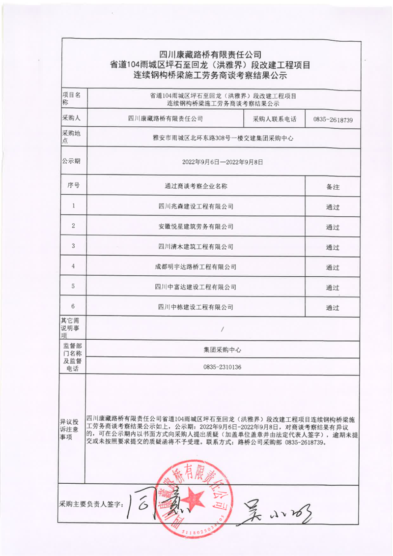 四川康藏路橋有限責(zé)任公司省道104雨城區(qū)坪石至回龍(洪雅界)段改建工程項目連續(xù)鋼構(gòu)橋梁施工勞務(wù)商談考察結(jié)果公示