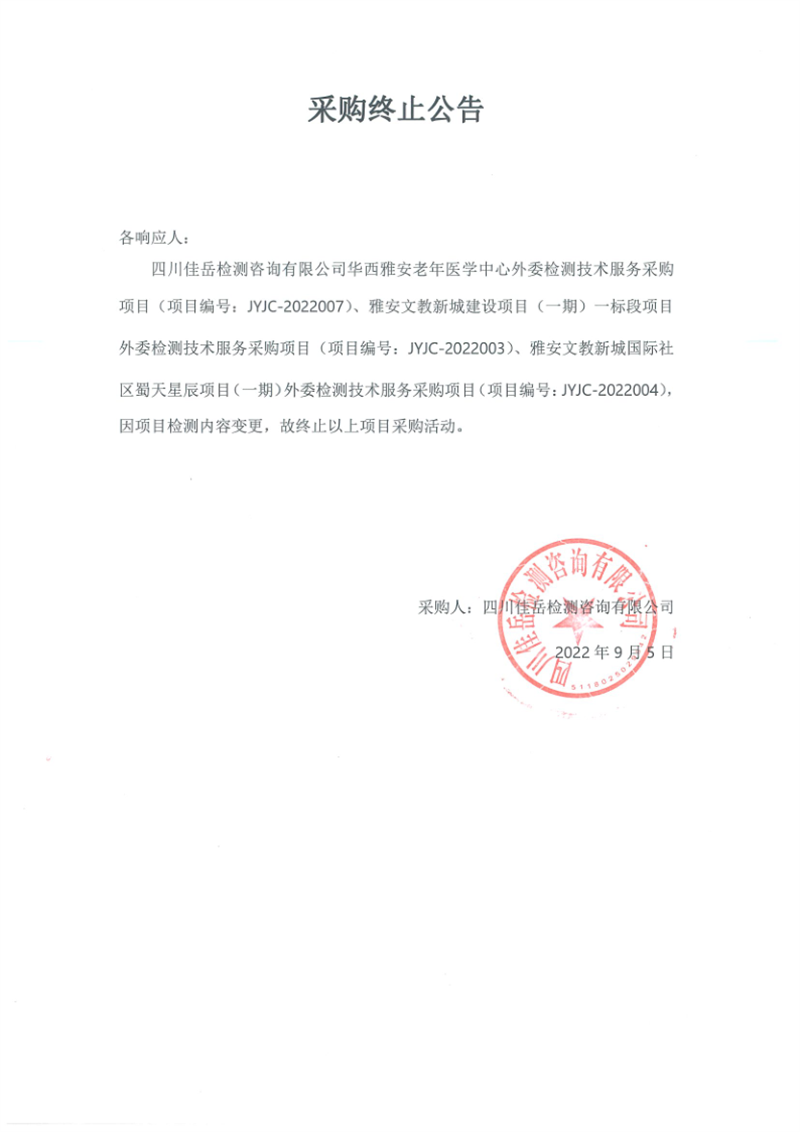 四川佳岳檢測(cè)咨詢(xún)有限公司采購(gòu)項(xiàng)目(項(xiàng)目編號(hào):JYJC-2022007、JYJC-2022003、JYJC-2022004)采購(gòu)中止公告