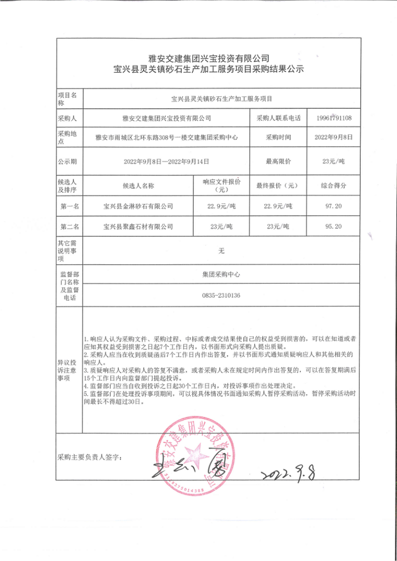 雅安交建集團興寶投資有限公司寶興縣靈關鎮(zhèn)砂石生產(chǎn)加工服務項目采購結(jié)果公示