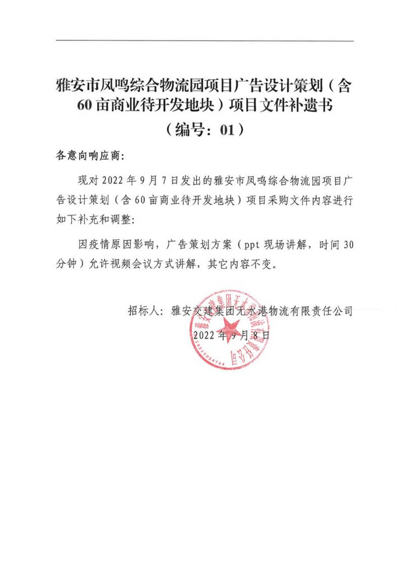 雅安交建集團(tuán)無水港物流有限責(zé)任公司雅安市鳳鳴綜合物流園項(xiàng)目廣告設(shè)計(jì)策劃(含60畝商業(yè)待開發(fā)地塊)項(xiàng)目文件補(bǔ)遺書(編號(hào):01)