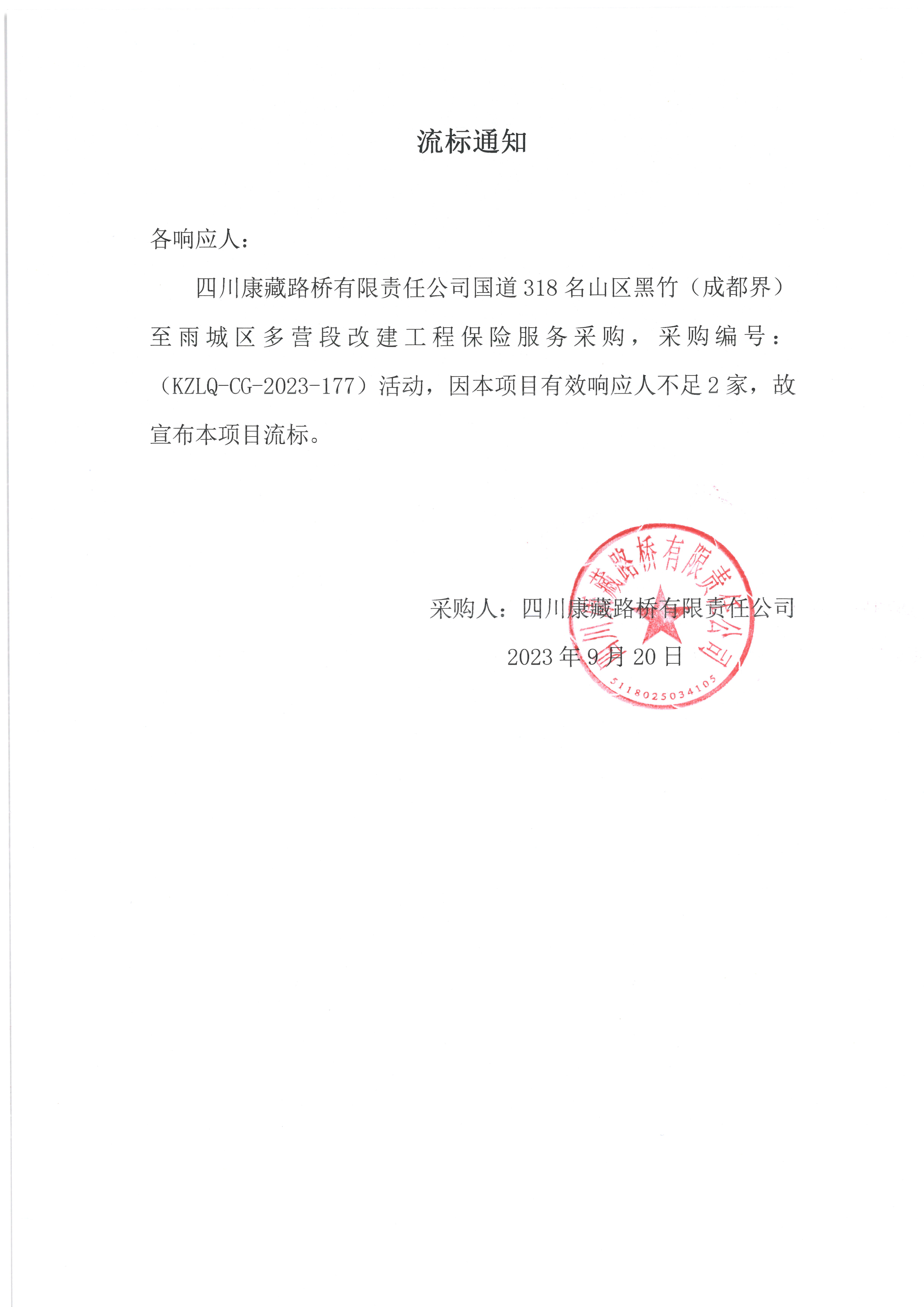 四川康藏路橋有限責(zé)任公司國(guó)道318名山區(qū)黑竹(成都界)至雨城區(qū)多營(yíng)段改建工程保險(xiǎn)服務(wù)采購(gòu)流標(biāo)通知