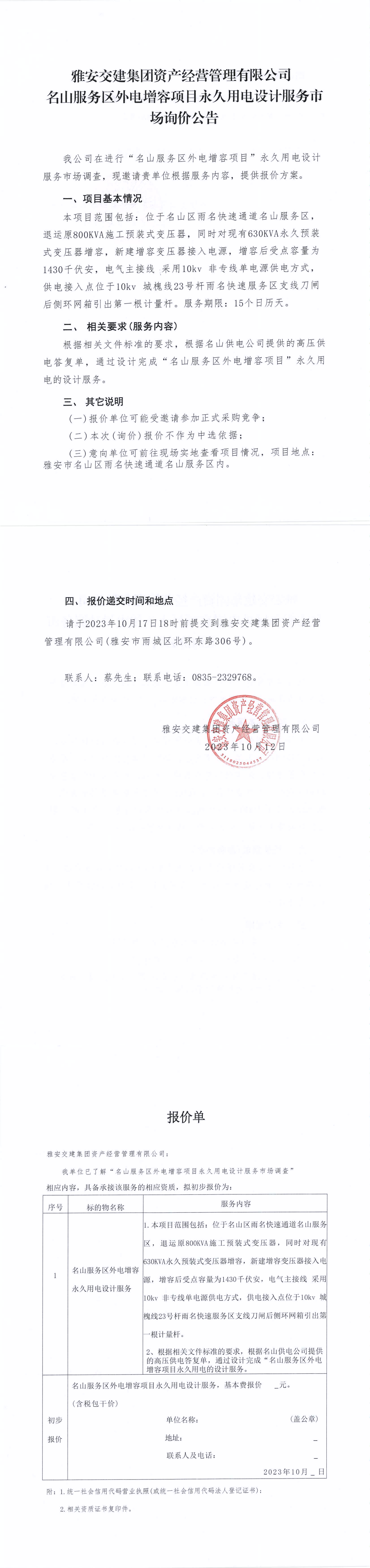 雅安交建集團資產(chǎn)經(jīng)營管理有限公司名山服務(wù)區(qū)外電增容項目永久用電設(shè)計服務(wù)市場詢價公告