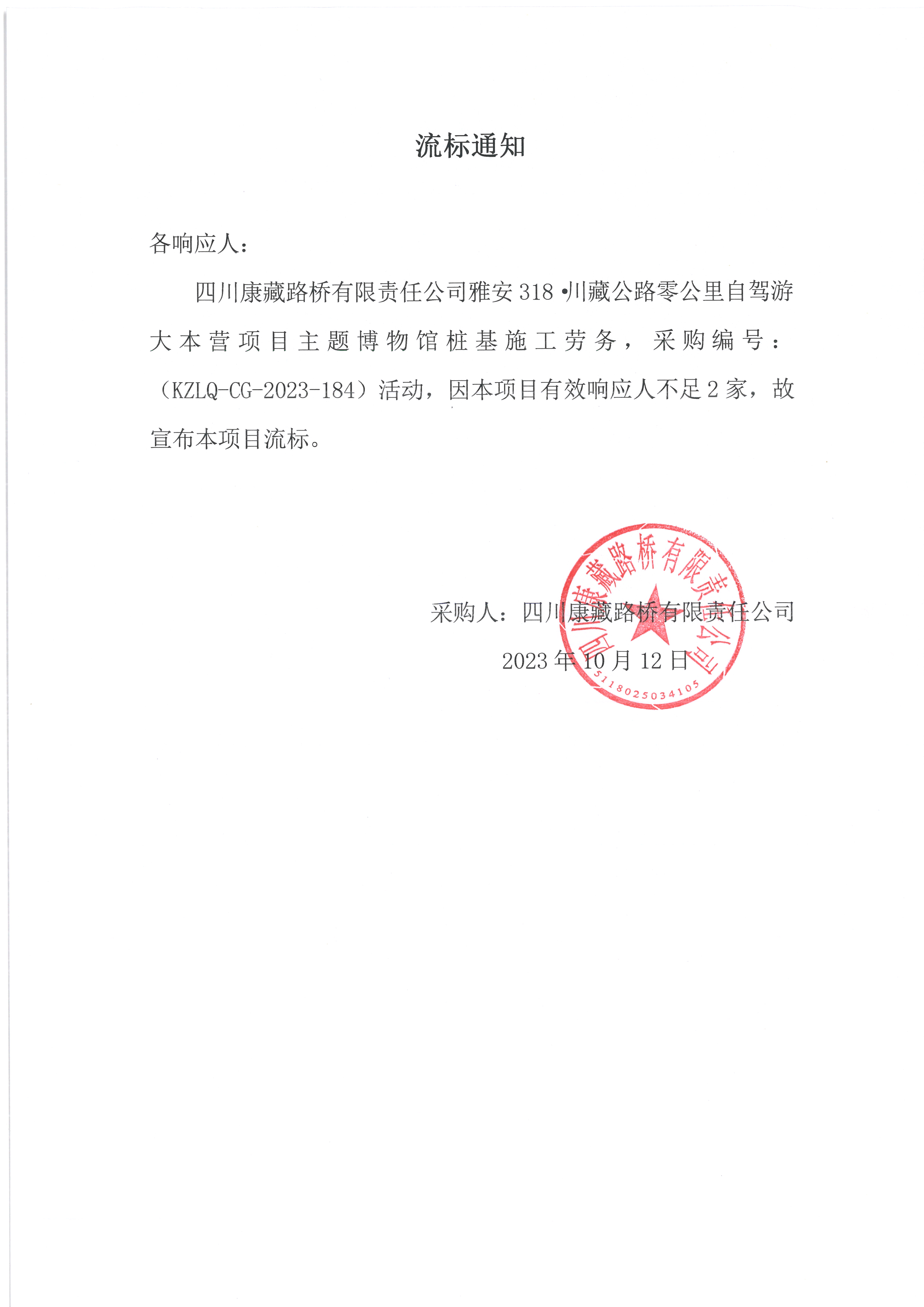 四川康藏路橋有限責任公司雅安318·川藏公路零公里自駕游大本營項目主題博物館樁基施工勞務流標通知