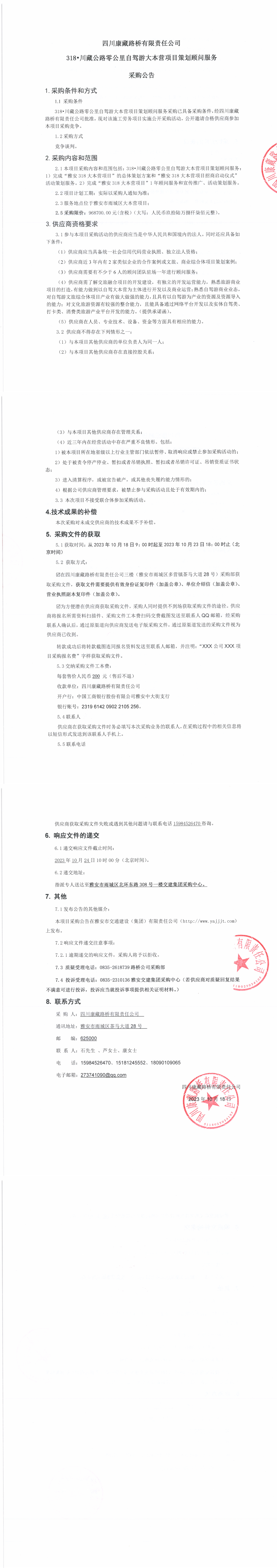 四川康藏路橋有限責(zé)任公司318•川藏公路零公里自駕游大本營(yíng)項(xiàng)目策劃顧問(wèn)服務(wù)采購(gòu)公告